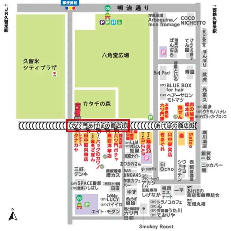 久留米シティプラザの南側に位置する商店街で「あけぼの商店街」と「六ツ門商店街」の間にあります。